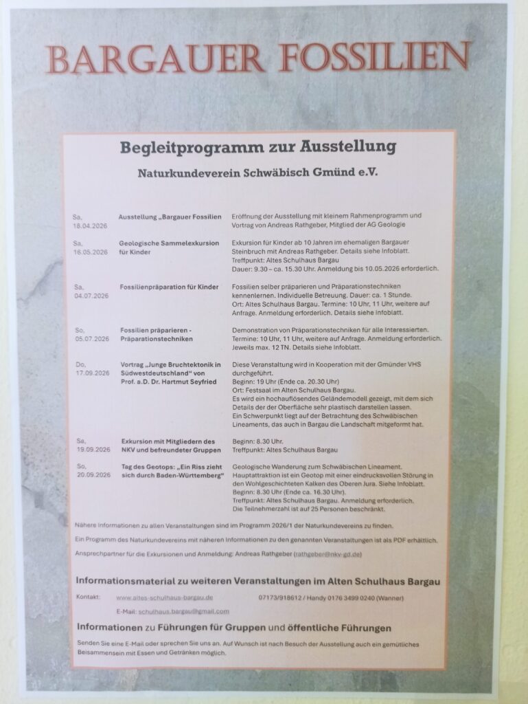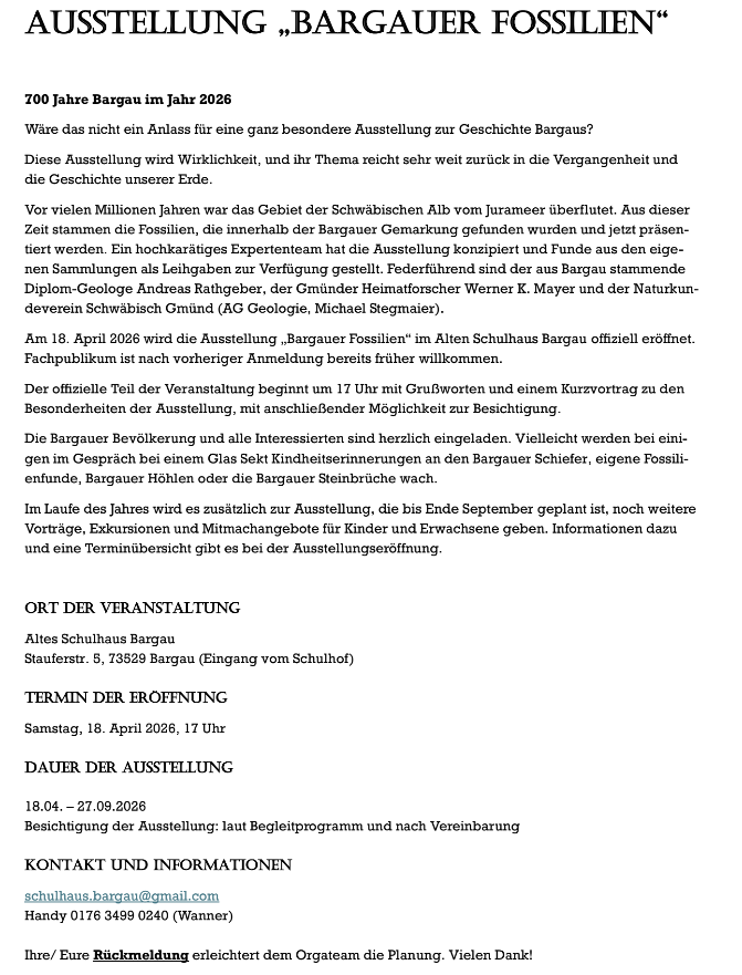 Tauchen Sie ein in die Erd- und Ortsgeschichte: In unserem Haus präsentieren wir eine ausgewählte Ausstellung von Fossilien, die in der Region rund um Bargau und der Schwäbischen Alb gefunden wurden. Von versteinerten Muscheln über uralte Pflanzen-Abdrücke bis hin zu Gesteinsformationen – diese Stücke erzählen Geschichten von längst vergangenen Meeren und Gebirgsbildungen. Ein spannender Blick zurück in die Vergangenheit macht Ihren Aufenthalt bei uns auch zu einem kleinen Lern- und Entdeckungsraum.